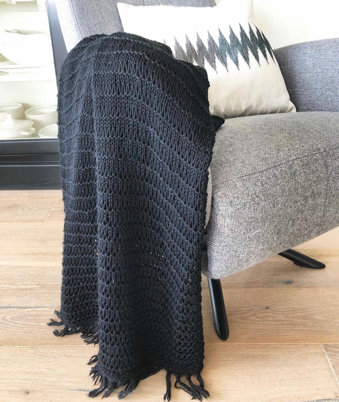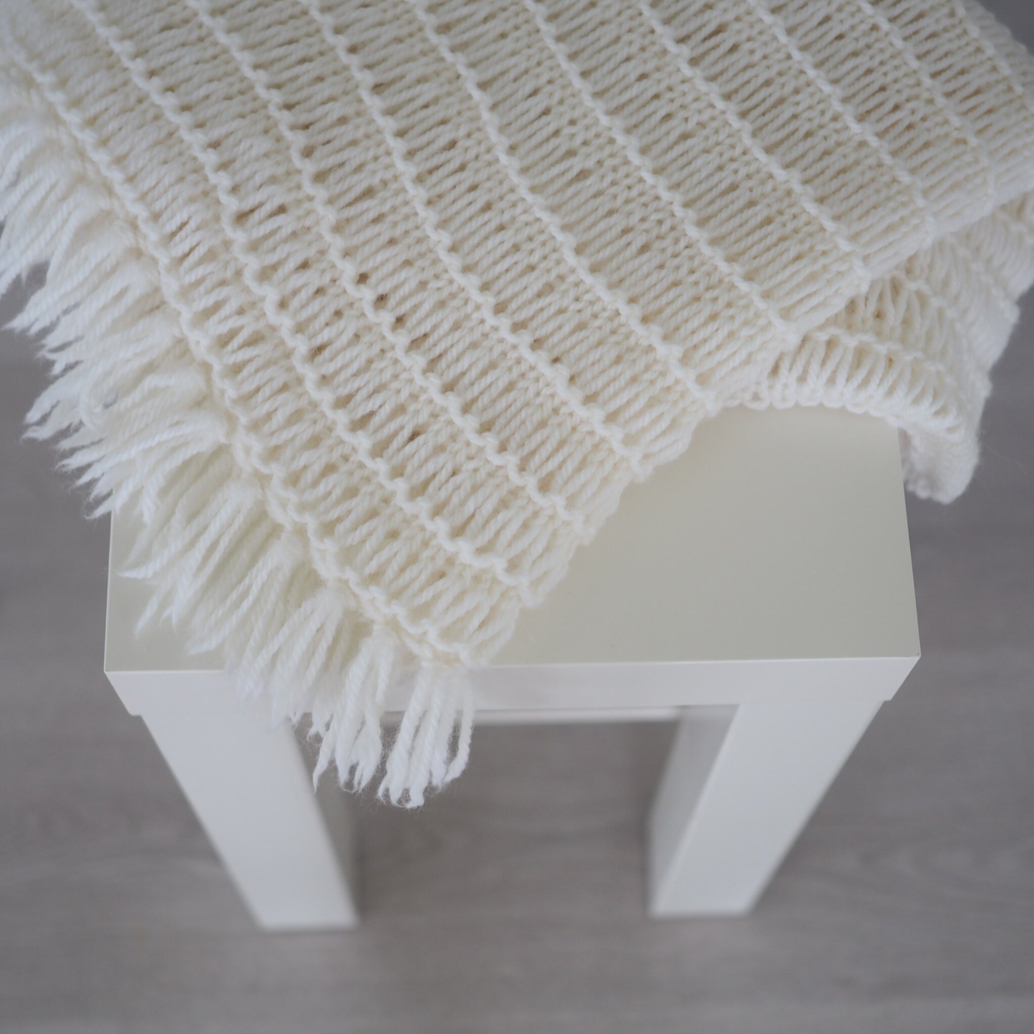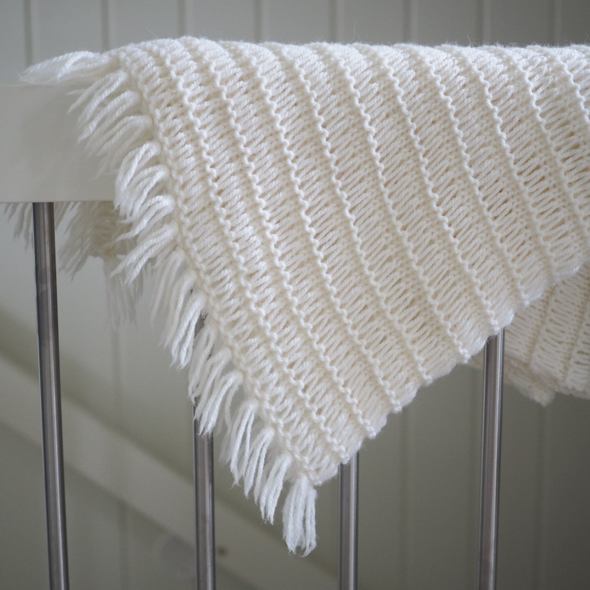 Ett teppe som som er relativt enkelt å strikke. Her kan du velge mellom 22/10 garn eller 18/10 garn, og du kan strikke det som vognteppe, babyteppe eller pledd.